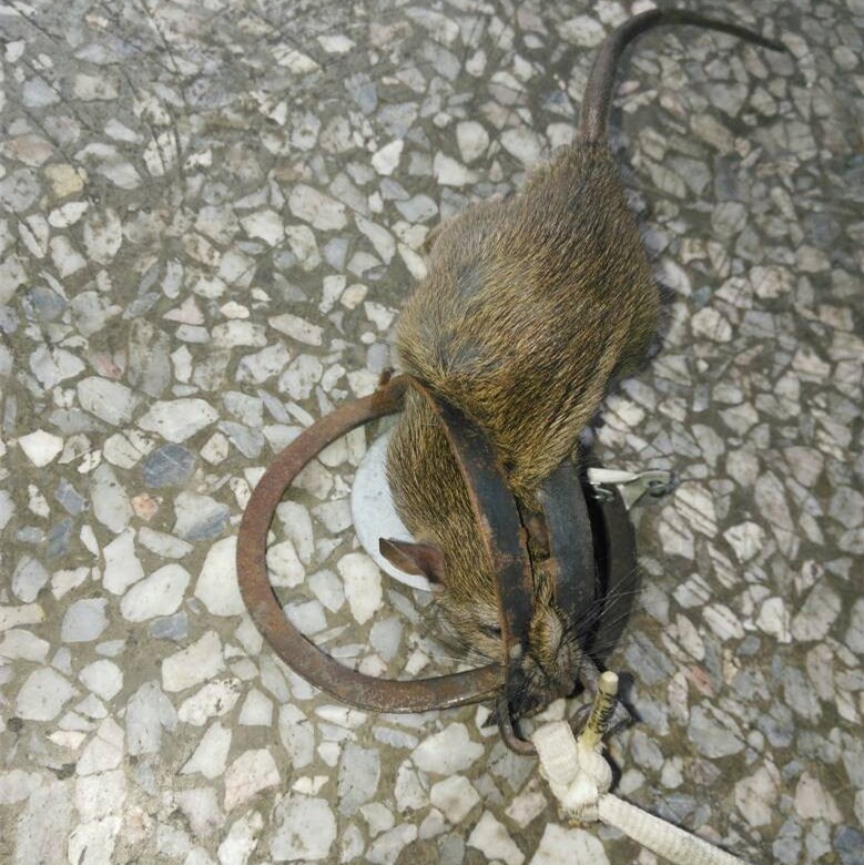 (3)放夾時(shí)要注意自身安全,壓簧桿掛上之后,手始終不要接觸前端(夾老鼠的那端)。鼠夾放好后不得有人在現(xiàn)場(chǎng)走動(dòng),鼠夾要晚放晨收,專人負(fù)責(zé)。在可能情況下,捕到老鼠后馬上重新放置。收夾時(shí)最好拿根棍子敲擊未捕到鼠、上弦待發(fā)的夾子,使壓簧桿復(fù)位后再用手撿。